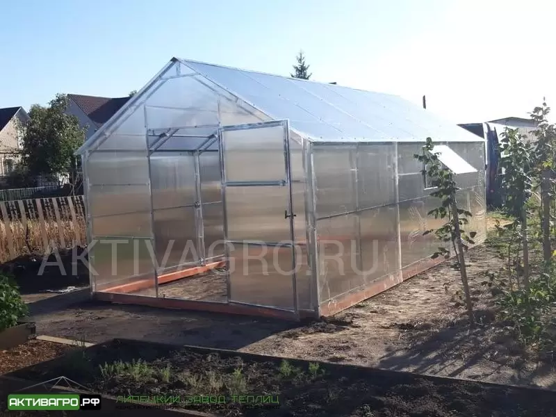 Завод «АКТИВАГРО» производит домики из светопрозрачного поликарбоната с двухскатными крышами. Для сбора урожая в сезон жители разных регионов страны могут купить на сайте со скидкой теплицу «Ударница Англичанка» с сертификатом соответствия. Каркас шириной 2.5/3 м и высотой скатов 2,25 м изготовлен из двойной трубы сечением 20х20 + 20х20 мм с двухсторонней оцинковкой.
